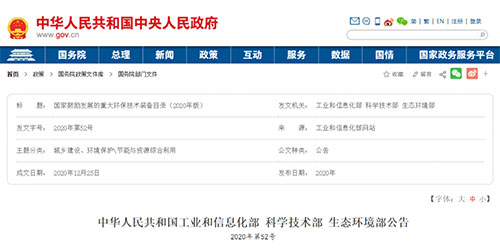 據(jù)了解,2020年12月25日,工業(yè)和信息化部、科學(xué)技術(shù)部和生態(tài)環(huán)境部聯(lián)合發(fā)布2020年第52號(hào)公告——《中華人民共和國工業(yè)和信息化部 科學(xué)技術(shù)部 生態(tài)環(huán)境部公告》(以下簡稱《公告》 )。《公告》指出,為加快先進(jìn)環(huán)保裝備研發(fā)和應(yīng)用推廣,提升環(huán)保裝備制造業(yè)整體水平和供給質(zhì)量,工業(yè)和信息化部、科學(xué)技術(shù)部、生態(tài)環(huán)境部聯(lián)合制定了《國家鼓勵(lì)發(fā)展的重大環(huán)保技術(shù)裝備目錄(2020年版)》。現(xiàn)予公告。