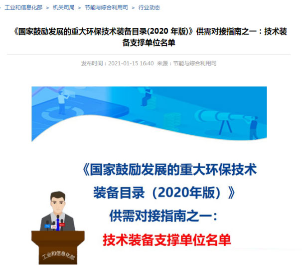 2021年1月15日,工業(yè)和信息化部節(jié)能與綜合利用司發(fā)布了《國家鼓勵(lì)發(fā)展的重大環(huán)保技術(shù)裝備目錄(2020 年版)》供需對(duì)接指南之一:技術(shù)裝備支撐單位名單——其中,明確指出,濰坊天潔環(huán)保科技有限公司是“礦山粉塵治理成套裝備”關(guān)鍵技術(shù)的主要支撐單位!