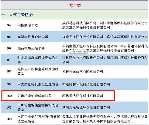 濰坊天潔環(huán)保科技有限公司“礦山粉塵治理成套裝備”列入《國家鼓勵(lì)發(fā)展的重大環(huán)保技術(shù)裝備目錄》