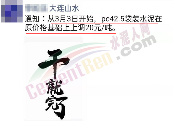 日前,大連山水銷售經(jīng)理通知從3月3日起PC42.5袋裝水泥在原價格基礎上上調(diào)20元/噸。