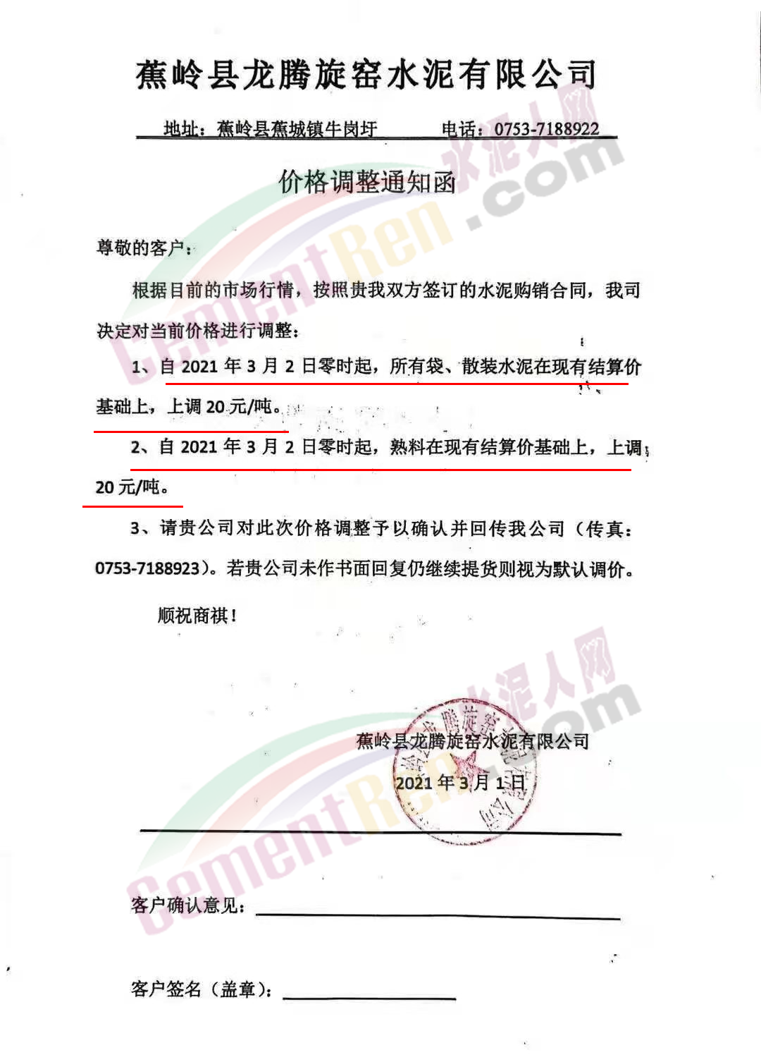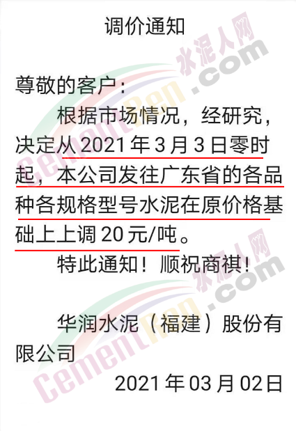 根據(jù)目前市場情況,經(jīng)公司研究,決定從2021年3月2日零時起,本公司發(fā)往廣東省內(nèi)各品種各規(guī)格型號水泥、熟料在原價格基礎上上調(diào)20元/噸。