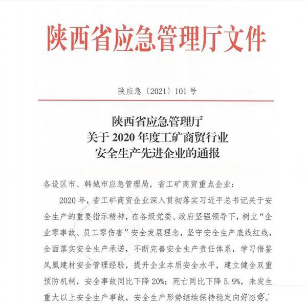 3月2日,從陜西省應(yīng)急管理廳獲悉,陜煤新材集團富平公司因安全生產(chǎn)基礎(chǔ)扎實、工作成績顯著,榮獲“2020年度工礦商貿(mào)行業(yè)安全生產(chǎn)先進企業(yè)”稱號。這是繼今年1月陜煤新材安全環(huán)保部獲集團“安全先進部門”榮譽稱號之后,公司在安全環(huán)保領(lǐng)域獲得的又一殊榮。