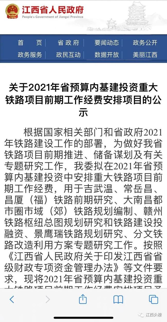 截至2020年末,江西省鐵路營業(yè)里程達(dá)4941公里,其中高鐵1898公里,為促進(jìn)江西經(jīng)濟(jì)社會(huì)發(fā)展提供了強(qiáng)大支撐。“十四五”期間進(jìn)一步加強(qiáng)路省合作、努力實(shí)現(xiàn)新時(shí)代江西鐵路高質(zhì)量發(fā)展。昨日,江西省發(fā)改委發(fā)布《關(guān)于2021年省預(yù)算內(nèi)基建投資重大鐵路項(xiàng)目前期工作經(jīng)費(fèi)安排項(xiàng)目的公示》,全文如下:根據(jù)國家相關(guān)部門和省政府2021年鐵路建設(shè)工作的部署,為做好我省鐵路項(xiàng)目前期推進(jìn)、儲(chǔ)備謀劃及有關(guān)專題研究工作,我委擬在2021年省預(yù)算內(nèi)基建投資中安排重大鐵路項(xiàng)目前期工作經(jīng)費(fèi),用于吉武溫、常岳昌、昌廈(福)鐵路前期研究、大南昌都市圈市域(郊)鐵路規(guī)劃編制、贛州鐵路樞紐總圖規(guī)劃研究和鐵路建設(shè)投融資、景鷹瑞鐵路規(guī)劃研究、分文鐵路改造利用方案專題研究工作。