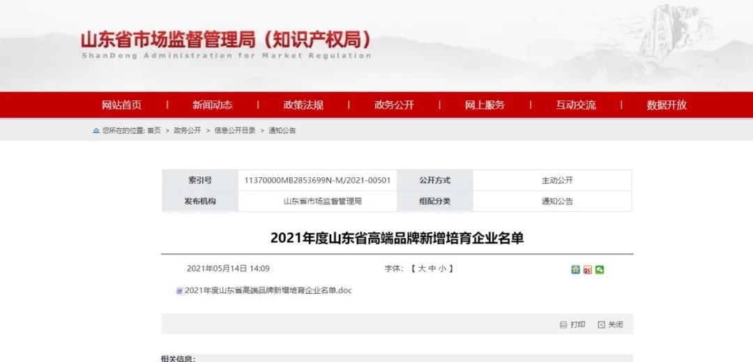 點贊!鑫金山入選2021年度山東省高端品牌新增培育企業(yè)名單