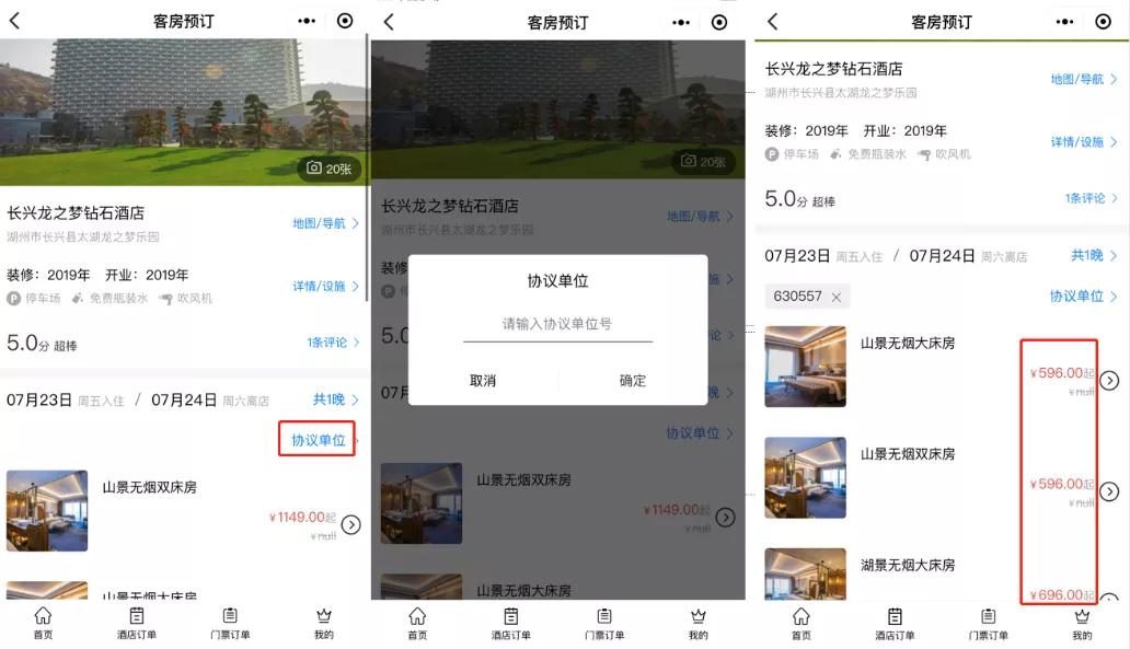 第三步:點擊協(xié)議單位,選擇入住時間段,輸入?yún)f(xié)議單位號630557,享受酒店優(yōu)惠協(xié)議價格。