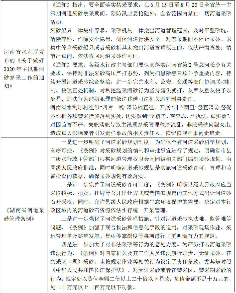 隨著政策的逐漸完善和民眾環(huán)保意識(shí)的增強(qiáng),砂石行業(yè)的發(fā)展進(jìn)入“機(jī)會(huì)和挑戰(zhàn)”并存時(shí)期,砂石礦山的發(fā)展正逐步走向正規(guī)化、規(guī)?;?、綠色化。2019年11月,工信部、國(guó)家發(fā)改委等十部門(mén)聯(lián)合印發(fā)《關(guān)于推進(jìn)機(jī)制砂石行業(yè)高質(zhì)量發(fā)展的若干意見(jiàn)》指出,到2025年形成完善合理的機(jī)制砂石供應(yīng)保障體系;2020年3月,國(guó)家發(fā)改委聯(lián)合十五部門(mén)印發(fā)《關(guān)于促進(jìn)砂石行業(yè)健康有序發(fā)展的指導(dǎo)意見(jiàn)》要求,綜合施策、多措并舉,合理控制河湖砂開(kāi)采,逐步