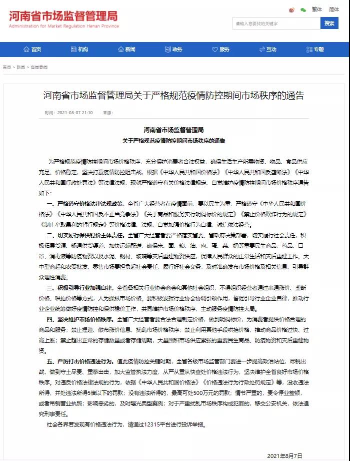 河南省市場監(jiān)管局在此提醒:社會各界若發(fā)現(xiàn)有價格違法行為,請通過12315平臺進(jìn)行投訴舉報。