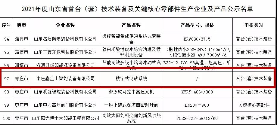 日前,山東省工業(yè)和信息化廳公示了2021年度山東省首臺(tái)(套)技術(shù)裝備及關(guān)鍵核心零部件生產(chǎn)企業(yè)及產(chǎn)品名單和省首臺(tái)(套)技術(shù)裝備及關(guān)鍵核心零部件推廣應(yīng)用指導(dǎo)目錄,棗莊鑫金山智能裝備有限公司“樓宇式制砂系統(tǒng)”成功入選名單并列入指導(dǎo)目錄。截止目前,鑫金山已有6項(xiàng)科技成果列入省級(jí)首臺(tái)(套)技術(shù)裝備,充分展示了公司在科技創(chuàng)新方面的能力與水平。