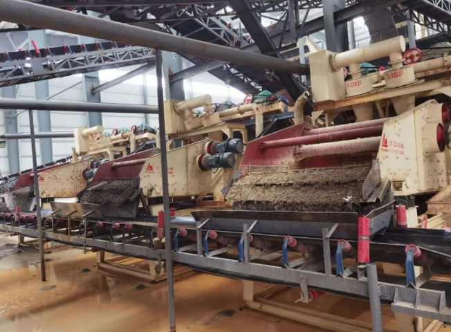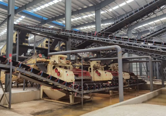 沖擊式破碎機(jī),同時(shí)配備了YKJ振動(dòng)篩、螺旋洗砂機(jī)、ZKX系列細(xì)砂回收一體機(jī)等篩分及洗砂裝備,污水處理階段則采用液壓板框壓濾機(jī)等。