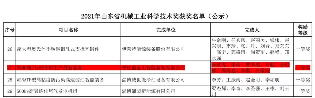 日前,山東省機械工業(yè)科學技術協(xié)會根據(jù)《關于組織申報2021年山東省機械工業(yè)科學技術獎的通知》(魯機科協(xié)〔2021〕2號)文件要求,經省機械工業(yè)科學技術獎專家委員會評審、表決通過,正式公布了2021年度山東省機械工業(yè)科學技術獎評選結果。棗莊鑫金山智能裝備有限公司自主研發(fā)的“3500噸/臺時骨料生產成套裝備”項目,憑借其極大的處理能力,強大的智能控制系統(tǒng)以及效率高、能耗低、運行可靠、噪聲低,結構簡單、操作簡便等優(yōu)點,從眾多項目中脫穎而出,成功榮獲《2021年山東省機械工業(yè)科學技術獎》一等獎!