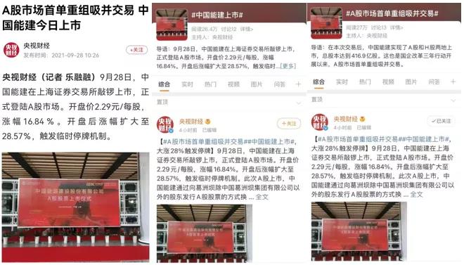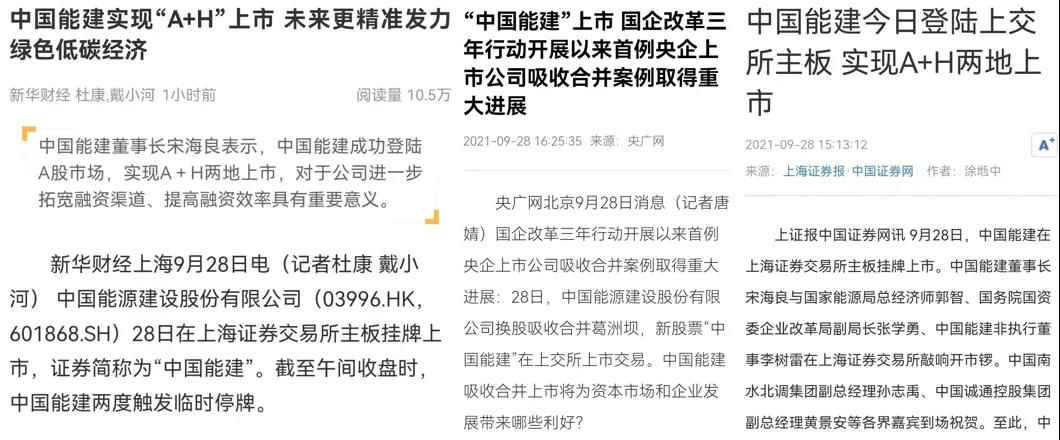 此次中國(guó)能建成功實(shí)現(xiàn)A+H兩地上市,得到了央視財(cái)經(jīng)、新華財(cái)經(jīng)、央廣網(wǎng)、上海證券報(bào)等國(guó)家權(quán)威主流媒體的重點(diǎn)關(guān)注和報(bào)道。