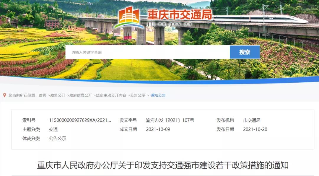 重慶:印發(fā)《支持交通強(qiáng)市建設(shè)若干政策措施》