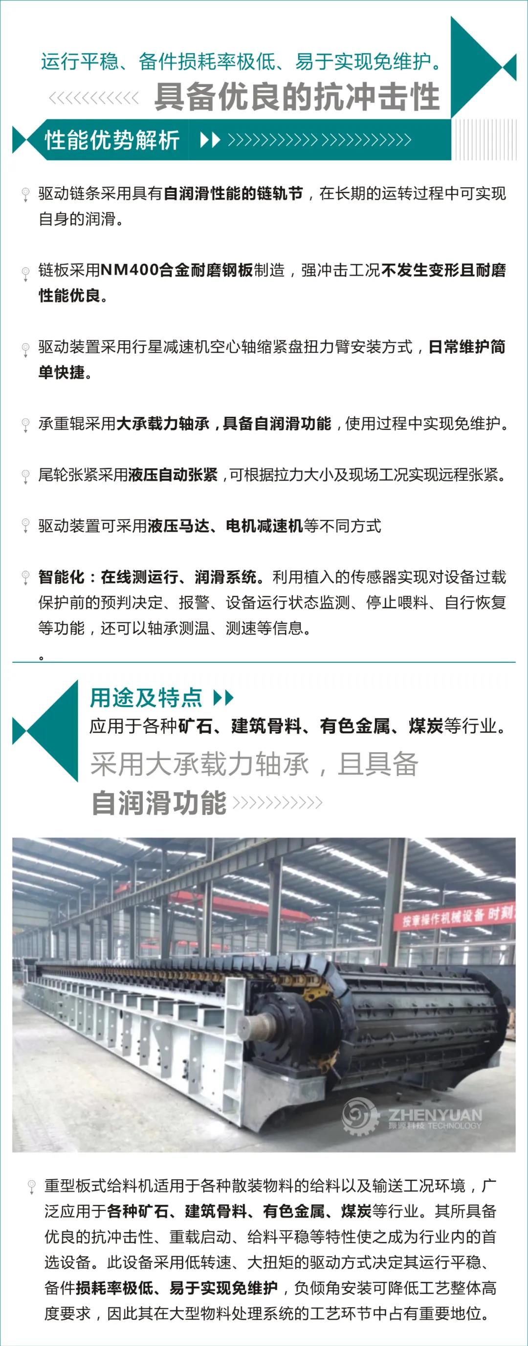 為了適應(yīng)對(duì)生產(chǎn)能力大型化的破碎需求,振源科技根據(jù)以往生產(chǎn)重型板式給料機(jī)的現(xiàn)場(chǎng)經(jīng)驗(yàn)并結(jié)合國(guó)內(nèi)外的先進(jìn)經(jīng)驗(yàn),研發(fā)設(shè)計(jì)了具備優(yōu)良的抗沖擊性的重型板式給料機(jī),具有運(yùn)行平穩(wěn)、備件損耗率極低、易于實(shí)現(xiàn)免維護(hù)的優(yōu)勢(shì)。