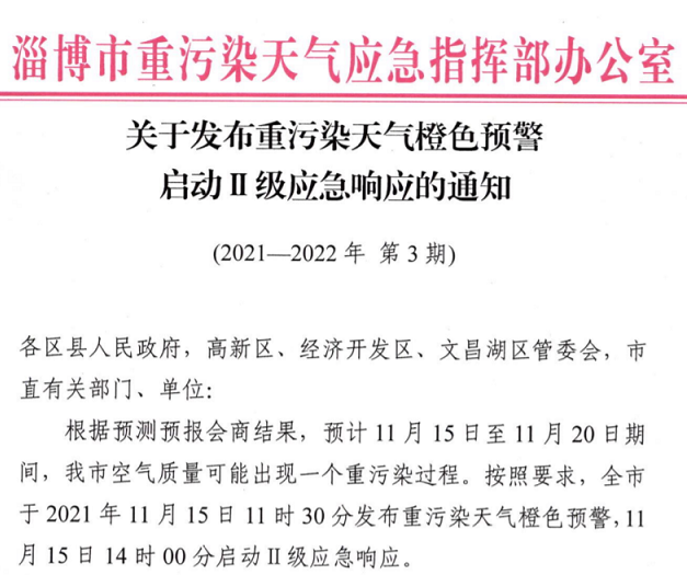淄博市重污染天氣應急指揮部辦公室發(fā)布《關(guān)于發(fā)布重污染天氣橙包預警啟動Ⅱ級應急響應的通知》,全市于2021年11月15日11時30分發(fā)布重污染天氣橙色預警,11月15日14時00分啟動II級應急響應。