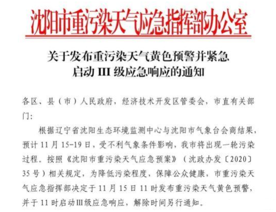 經(jīng)預測,受不利氣象條件影響,11月15日20時以后,我市可能出現(xiàn)大氣持續(xù)重污染過程。為做好防范應對工作,經(jīng)中國環(huán)科院大氣所專家組研究并報市政府同意,決定發(fā)布重污染天氣黃色預警,并于11月15日20時起全市啟動Ⅲ級應急響應。重污染天氣預警解除時間另行通知。現(xiàn)將應急響應措施公告如下: