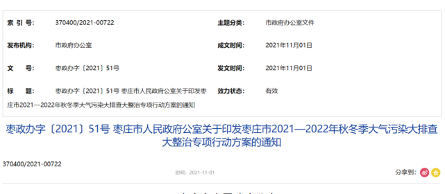 棗莊市人民政府辦公室印發(fā)《棗莊市2021—2022年秋冬季大氣污染大排查大整治專項行動方案》(以下簡稱“通知”),方案明確了主要目標,秋冬季期間(2021年10月1日至2022年3月31日),全市PM2.5平均濃度不高于65.3微克/立方米,重度及以上污染天數(shù)不高于7天。