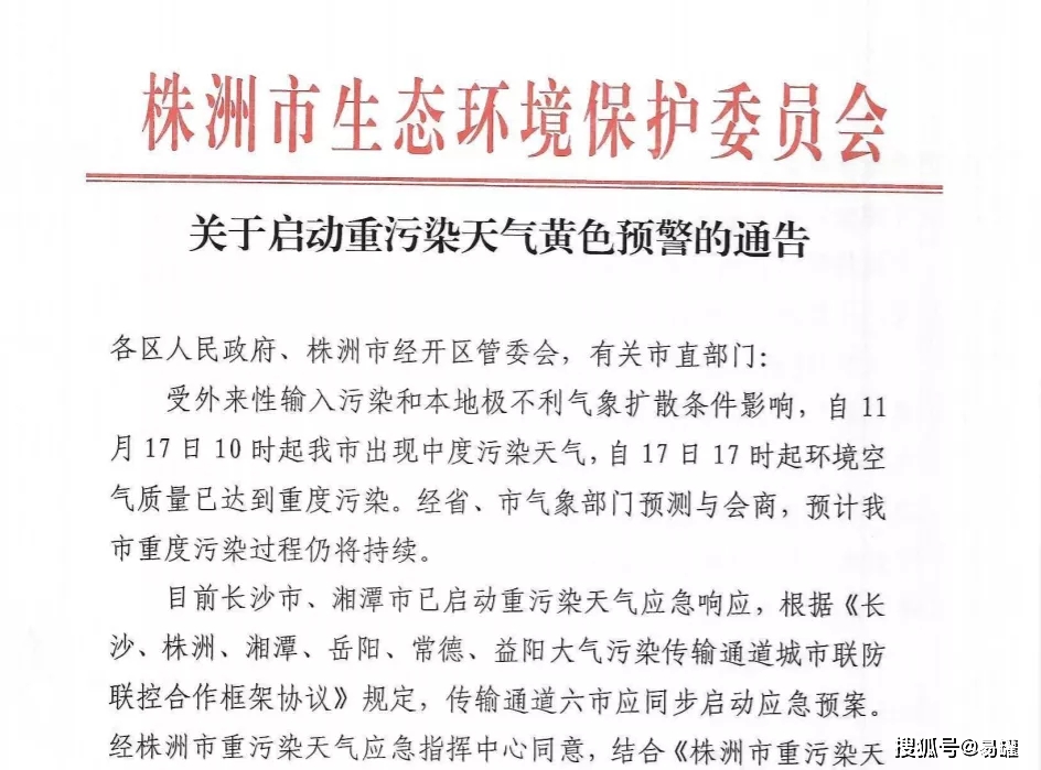 株洲市決定于2021年11月17日21時起,啟動重污染天氣黃色預(yù)警,同時啟動黃色Ⅲ級響應(yīng)措施。