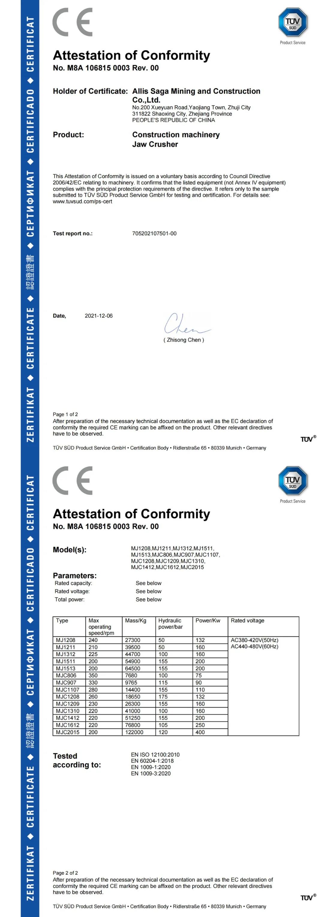 經(jīng)過8個(gè)月緊張、全面、嚴(yán)格的認(rèn)證,值此埃里斯克新工廠投入使用之際,MJ和MJC兩大系列顎式破碎機(jī)通過T?V南德意志集團(tuán)(T?V S?D)認(rèn)證并成功取得CE認(rèn)證證書。繼2020年10月及2021年2月埃里斯克全系列單缸液壓圓錐式破碎機(jī)通過T?V認(rèn)證后,又一核心產(chǎn)品——顎式破碎機(jī)獲得該項(xiàng)認(rèn)證,為埃里斯克進(jìn)一步拓展海外市場(chǎng),更多產(chǎn)品進(jìn)入歐洲市場(chǎng)奠定了堅(jiān)實(shí)的基礎(chǔ);同時(shí)也進(jìn)一步滿足了國(guó)內(nèi)高端客戶的需求。