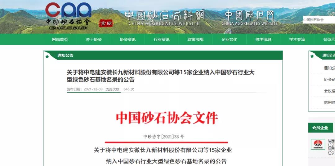 在中國(guó)砂石協(xié)會(huì)開(kāi)展的2020年度中國(guó)砂石行業(yè)大型綠色砂石基地評(píng)選工作中,申報(bào)資料初審、專家實(shí)地核查和現(xiàn)場(chǎng)評(píng)估基礎(chǔ)上,經(jīng)專家組評(píng)審,并經(jīng)過(guò)公示,中電建安徽長(zhǎng)九新材料股份有限公司“年產(chǎn)7000萬(wàn)噸石灰?guī)r綠色砂石基地”項(xiàng)目被納入2020年度中國(guó)砂石行業(yè)大型綠色砂石基地名錄。