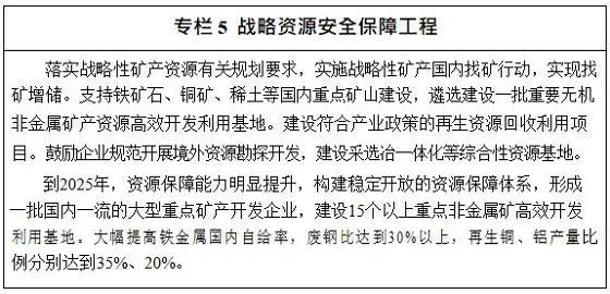 拓展多元化資源供給渠道。開發(fā)“城市礦山”資源,支持優(yōu)勢企業(yè)建立大型廢鋼及再生鋁、銅、鋰、鎳、鈷、鎢、鉬等回收基地和產業(yè)集聚區(qū),推進再生金屬回收、拆解、加工、分類、配送一體化發(fā)展。構建國家和企業(yè)共同參與,產品儲備和資源地儲備相結合的礦產資源儲備體系。完善礦石交易市場體系,形成公開透明、公正合理的定價機制。推進礦產資源領域國際合作,按照平等互利、合作共贏原則,優(yōu)化境外投資結構和布局,規(guī)范有序參與境外資源開發(fā),增強礦產資源全球經略能力。鼓勵輕烴等低碳石化原料進口。嚴格執(zhí)行再生資源進口標準,推進優(yōu)質再生資源進口。