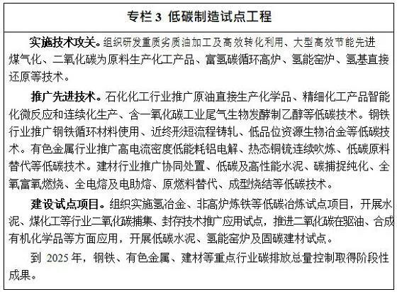 圍繞碳達峰、碳中和目標節(jié)點,強化碳效率發(fā)展理念,全面實施碳減排行動,將碳排放納入環(huán)境影響評價,發(fā)揮減污降碳協(xié)同效應。制定石化化工、鋼鐵、有色金屬、建材等重點行業(yè)碳達峰實施方案,確保2030年前實現(xiàn)達峰,鼓勵有條件的行業(yè)、企業(yè)率先達峰。支持企業(yè)實施原料、燃料替代,加快推進工業(yè)煤改電、煤改氣,提高可再生資源和清潔能源使用比例。支持企業(yè)利用余熱余壓發(fā)電、并網。支持鋼鐵、水泥等重點行業(yè)構建生產全過程碳排放統(tǒng)計核算、監(jiān)測與評估體系。加快推進原材料企業(yè)節(jié)能低碳改造升級,鼓勵企業(yè)建設能源管理中心,深入實施能源梯級利用。優(yōu)化產品貿易結構,鼓勵增加初級加工產品進口,嚴格控制高耗能、低附加值產品出口。加強重點行業(yè)節(jié)能監(jiān)察,貫徹強制性單位產品能耗限額標準。開展工業(yè)節(jié)能診斷服務。嚴格落實鋼鐵、水泥、電解鋁等重點行業(yè)階梯電價政策,完善有利于綠色低碳發(fā)展的差別化電價政策。