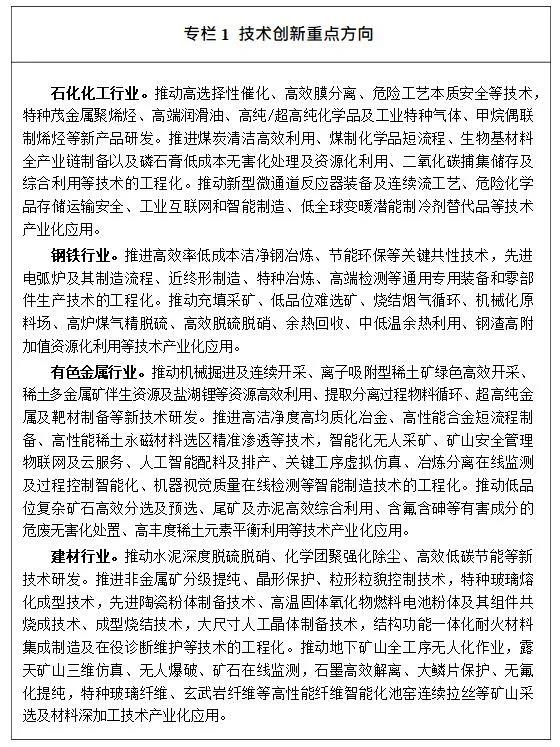 加強產學研用深度融合,推進科研院所、高校、企業(yè)科研力量優(yōu)化配置和資源共享,攻克復雜礦床及超深井礦山安全高效開采等礦山工藝技術;攻克成分組織均勻性控制、原料均化提純等工藝裝備技術,提高產品性能及其穩(wěn)定性;攻克電石法聚氯乙烯生產無汞化、低溫低濃度煙氣脫硫脫硝、細顆粒物化學團聚強化除塵、固廢(危廢)協(xié)同處置及資源化利用等污染物防治和資源綜合利用技術,提高資源能源利用率和超低排放水平;攻克在線檢測調控、原料物性快速識別和評價、設備全生命周期管理、故障診斷與預測性維護等智能制造技術,提升全要素生產率。組織先進適用技術推廣,滾動制定發(fā)布重點行業(yè)先進適用技術目錄。