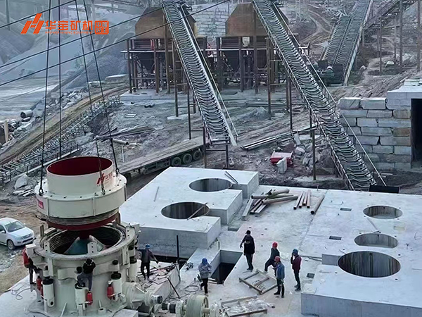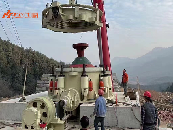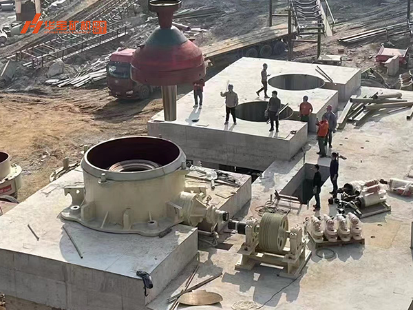 項(xiàng)目目前正處于設(shè)備安裝階段,工人正在安裝的是由華寶礦機(jī)研發(fā)生產(chǎn)的超大型圓錐式破碎機(jī)H900,該款破碎機(jī)最大可每小時(shí)可處理2500噸石料。