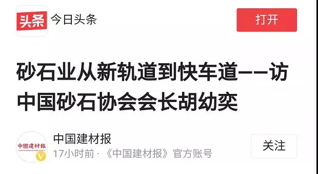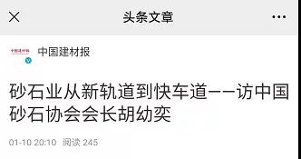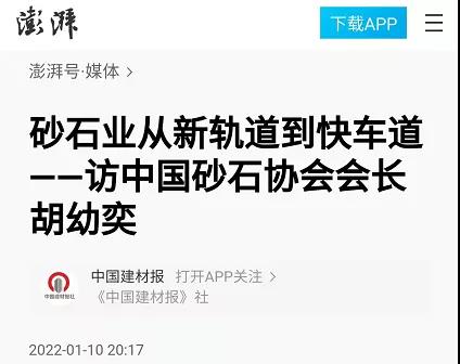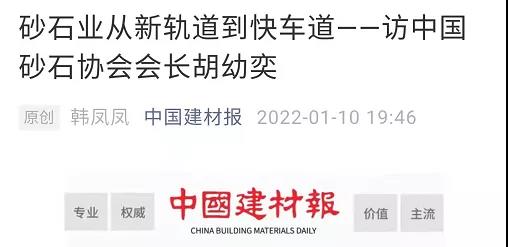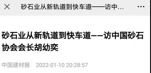 2022年1月10日,中國建材報對中國砂石協(xié)會會長胡幼奕進(jìn)行了專訪,相關(guān)內(nèi)容發(fā)布后,受到了社會各界的廣泛關(guān)注!中宣部學(xué)習(xí)強國在內(nèi)的多家媒體第一時間進(jìn)行了轉(zhuǎn)載報道!