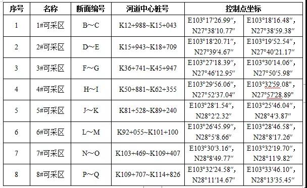 (三)規(guī)劃河段可采區(qū)控制點(diǎn)坐標(biāo)表: