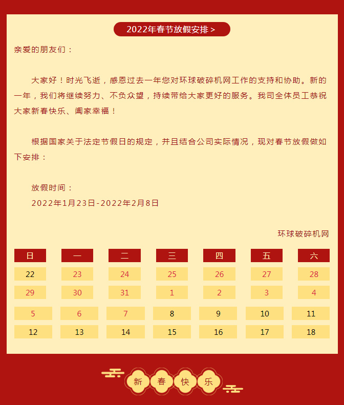 時(shí)光飛逝,感恩過去一年您對(duì)環(huán)球破碎機(jī)網(wǎng)工作的支持和協(xié)助。新的一年,我們將繼續(xù)努力、不負(fù)眾望,持續(xù)帶給大家更好的服務(wù)。我司全體員工恭祝大家新春快樂、虎年大吉、闔家幸福!
