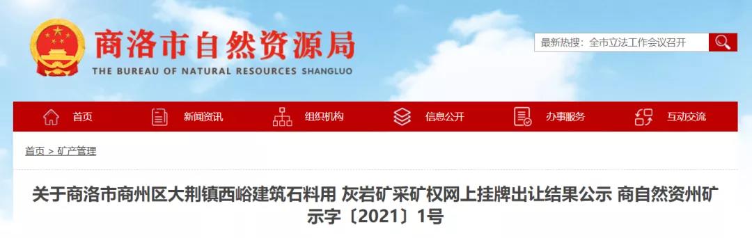 商洛市自然資源局商州分局關(guān)于商洛市商州區(qū)大荊鎮(zhèn)西峪建筑石料用灰?guī)r礦采礦權(quán)網(wǎng)上掛牌出讓結(jié)果公示