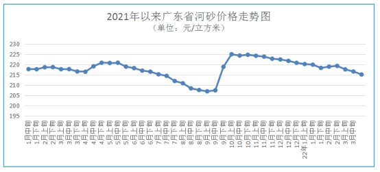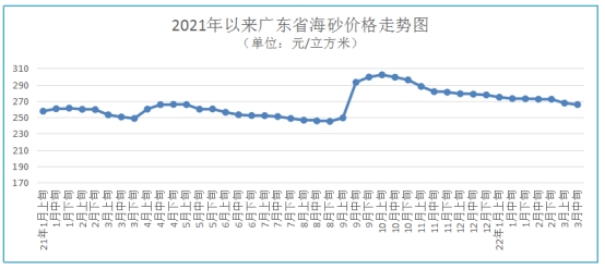 一、不同區(qū)域河砂價格漲跌互現(xiàn),海砂價格偏弱運行。據(jù)監(jiān)測,3月中旬全省河砂和海砂(淡化處理,下同)價格總體偏弱運行,但珠三角地區(qū)河砂價格小幅上漲。全省河砂平均購進價為每立方米215元,環(huán)比(與3月上旬比,下同)和同比(與2021年3月中旬比,下同)均微跌0.67%。其中,珠三角地區(qū)河砂平均購進價為每立方米255元,環(huán)比上漲6.63%;粵北和粵西地區(qū)河砂平均購進價分別為每立方米199元和163元,環(huán)比分別下跌2.02%和3.27%;粵東地區(qū)河砂平均購進價為每立方米242元,環(huán)比持平。珠三角地區(qū)海砂平均購進價為每立方米266元,環(huán)比微跌0.68%,同比上漲6.05%。