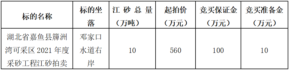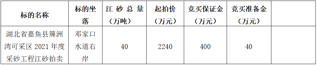 礦業(yè)有限公司委托,我公司定于2022年4月6日上午10時(shí),在嘉魚(yú)縣公共資源交易中心509室,依法舉行湖北省嘉魚(yú)縣簰洲灣可采區(qū)2021年度采砂工程江砂拍賣(mài)會(huì),現(xiàn)將有關(guān)事項(xiàng)公告如下: