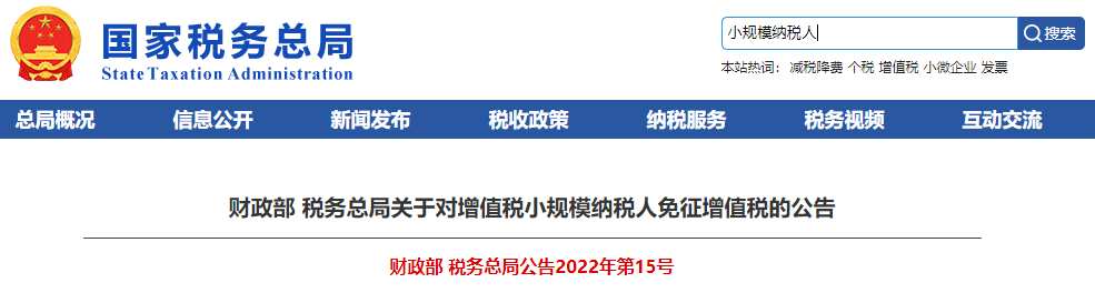 財政部 稅務總局關于對增值稅小規(guī)模納稅人免征增值稅的公告財政部 稅務總局公告2022年第15號