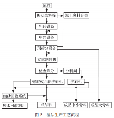 生產(chǎn)過程中水作為工作介質(zhì)和抑塵措施,全程參與砂石骨料的生產(chǎn),故稱為濕法工藝。濕法生產(chǎn)工藝一般在水資源較豐富的地區(qū)采用。