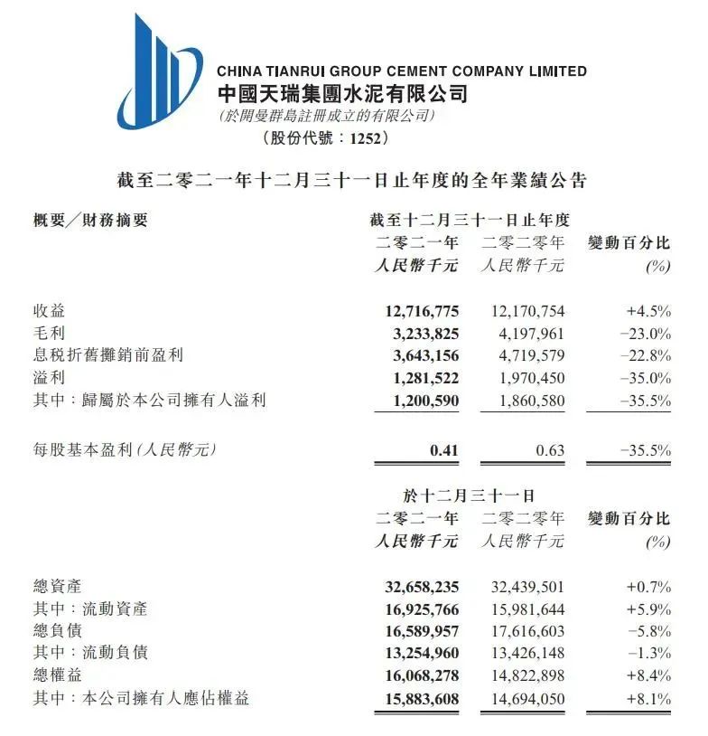 近日,中國天瑞水泥(01252)發(fā)布截至2021年12月31日止年度業(yè)績(jī),該集團(tuán)取得收益人民幣127.17億元,同比增加4.5%;歸屬于公司擁有人溢利12億元,同比減少35.5%。