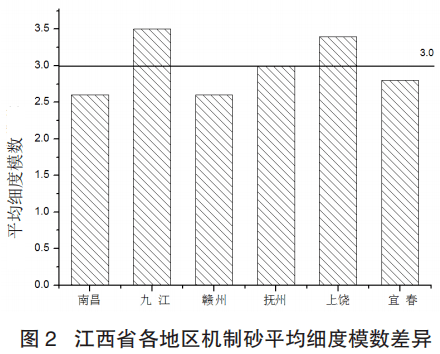 由圖表 1、2 可以得出:江西省機制砂細(xì)度模數(shù)均值為 3.0,即為中砂。南昌地區(qū)細(xì)度模數(shù)最小為 2.1,最大為 2.8,平均值為 2.6,離散較大,其普遍以中砂為主,低于江西省機制砂細(xì)度模數(shù)平均值。九江、贛州、撫州、上饒地區(qū)機制砂細(xì)度模數(shù)較為穩(wěn)定,離散不大。九江和上饒地區(qū)機制砂平均細(xì)度模數(shù)分別為 3.5 和 3.4,達(dá)到粗砂標(biāo)準(zhǔn),顯著高于江西省機制砂細(xì)度模數(shù)平均值。撫州地區(qū)機制砂平均細(xì)度模數(shù)與江西省機制砂細(xì)度模數(shù)平均值相同。贛州地區(qū)機制砂平均細(xì)度模數(shù)為 2.6,低于江西省機制砂細(xì)度模數(shù)平均值,且與南昌地區(qū)相當(dāng)。宜春地區(qū)細(xì)度模數(shù)最小為 2.1,最大為 3.2,平均值為 2.8,離散較大,且粗砂、中砂兼有,機制砂平均細(xì)度模數(shù)低于江西省機制砂細(xì)度模數(shù)平均值。從六個地區(qū)機制砂細(xì)度模數(shù)平均值可以看出,最小為 2.6,最大為 3.5,且省內(nèi)平均細(xì)度模數(shù)為 3.0,省內(nèi)機制砂分布離散較大。其中九江、上饒地區(qū)機制砂細(xì)度模數(shù)偏大,因其地域性原因(九江地區(qū)市場能夠供應(yīng)細(xì)度模數(shù)在 1.6 左右的細(xì)砂互摻使用,上饒地區(qū)同等強度等級混凝土配合比膠凝材料用量普遍高于其他地區(qū)),能夠改善因機制砂偏粗造成混凝土和易性差。