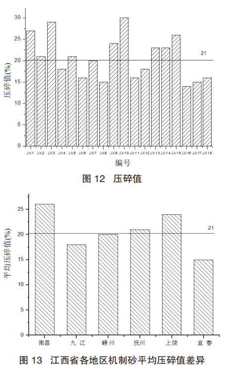 (5)江西省內(nèi)機制砂平均壓碎值為 21%,符合國家標(biāo)準(zhǔn) GB/T 14684—2011《建設(shè)用砂》中砂的單級最大壓碎值指標(biāo)不得高于 30% 的要求。南昌地區(qū)機制砂單級最大壓碎值指標(biāo)平均值為 26%,為省內(nèi)最高。宜春地區(qū)機制砂單級最大壓碎值指標(biāo)平均值為 15%,為省內(nèi)最低。
