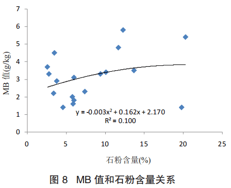 由圖 8 可知,機制砂的石粉含量與石粉含量呈二次函數(shù)關(guān)系,隨著石粉含量的增大機制砂的 MB 值呈遞增趨勢,二次函數(shù)的相關(guān)系數(shù)是 R2=0.100,表明兩者具有一定關(guān)系。原因是亞甲藍(lán)(Methylene Blue),又稱亞甲基藍(lán),是一種吩噻嗪類染料芳香雜環(huán)化合物,其化學(xué)式為 C16H18N3ClS,常被用作化學(xué)指示劑。亞甲藍(lán)溶液屬于陽離子染料,溶液中含有大量 C16H18N3S+離子,極易吸附在帶有相反電荷的黏土顆粒表面,因石粉含量越高,導(dǎo)致機制砂比表面積增大,亞甲藍(lán)更為容易被吸附,因此 MB 值升高。但從圖 8 多項式可以看出,石粉含量導(dǎo)致 MB 值升高影響相對較小。
