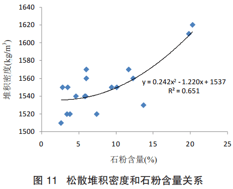 為了討論機制砂的石粉含量和堆積密度之間的關(guān)系,將試驗數(shù)據(jù)關(guān)系分析如圖 11 所示,機制砂的石粉含量與堆積密度呈二次函數(shù)關(guān)系,隨著石粉含量的增大機制砂的堆積呈二次函數(shù),隨著石粉含量增加逐步升高,二次函數(shù)的相關(guān)系數(shù)是 R2=0.651,表明兩者相關(guān)關(guān)系較大。原因是當(dāng)石粉含量提高,機制砂填充更為充分,因此松散堆積密度逐步增加。