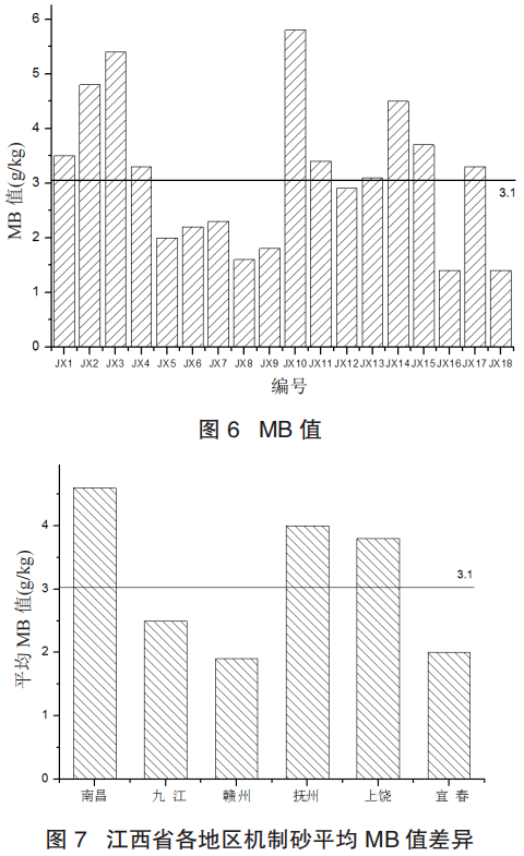 由表 5、表 6 和圖 6、圖 7 可以看出:江西省內(nèi)機制砂 MB 值平均值為 3.1g/kg,已顯著高于國家標(biāo)準(zhǔn) GB/T 14684—2011《建設(shè)用砂》中砂的 MB 值不得大于 1.4g/kg 的指標(biāo)。南昌地區(qū)平均 MB 值為 4.6g/kg,顯著高于江西省內(nèi)機制砂平均 MB 值,MB 值離散較大。九江地區(qū)平均 MB 值為 2.5g/kg,低于江西省內(nèi)機制砂 MB 值平均值,但依然高于國家標(biāo)準(zhǔn)規(guī)定值,離散較小。贛州地區(qū)平均 MB 值為 1.9g/kg,顯著低于江西省內(nèi)機制砂 MB 值平均值,但依然高于國家標(biāo)準(zhǔn)規(guī)定值,離散較小,為所選地區(qū)中 MB 值平均值最低。撫州地區(qū)平均 MB 值為 4.0g/kg,顯著高于江西省內(nèi)機制砂 MB 值平均值,離散大。上饒地區(qū)平均 MB 值為 3.8g/kg,高于江西省內(nèi)機制砂 MB 值平均值,且所有樣品 MB 值均高于江西省內(nèi)機制砂 MB 值平均值,離散較大。宜春地區(qū)平均 MB 值為 2.0g/kg,顯著低于江西省內(nèi)機制砂 MB 值平均值,但依然高于國家標(biāo)準(zhǔn)規(guī)定值。但宜春區(qū)域所選機制砂中,兩個樣品符合國家標(biāo)準(zhǔn) GB/T 14684—2011《建設(shè)用砂》中砂的 MB 值不得大于 1.4g/kg 的指標(biāo),因其離散大,造成平均 MB 值偏高。