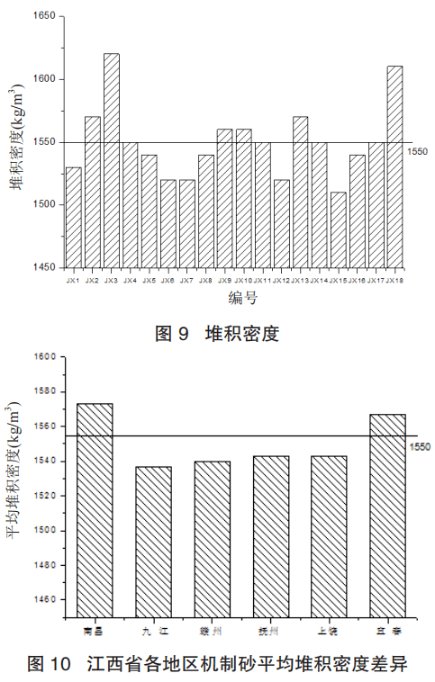 根據(jù)國家標(biāo)準(zhǔn) GB/T 14684—2011《建設(shè)用砂》中砂的松散堆積密度不小于 1400kg/m3,將全省機制砂松散堆積密度測試所得的數(shù)據(jù)進(jìn)行作圖分析,如表 7、表 8 和圖 9、圖 10 所示。