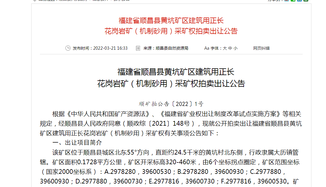 3月21日,福建省順昌縣黃坑礦區(qū)建筑用正長花崗巖礦(機(jī)制砂用)拍賣出讓,拍賣起始價1762萬元,增價幅度為50萬元或50萬元的整數(shù)倍,擬出讓10年(含基建期0.6年),設(shè)計(jì)生產(chǎn)規(guī)模為50萬立方米/年。礦區(qū)面積0.1728平方千米,礦石總資源量(推斷類型)為497.08萬立方米,擬出讓可采儲量469.61萬立方米。