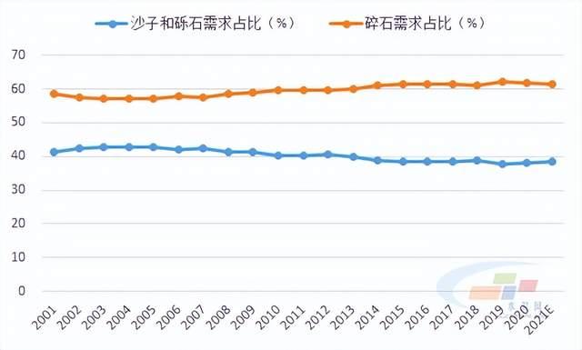 圖2-2:2001-2021年美國碎石需求占砂石總需求的比例有所上升