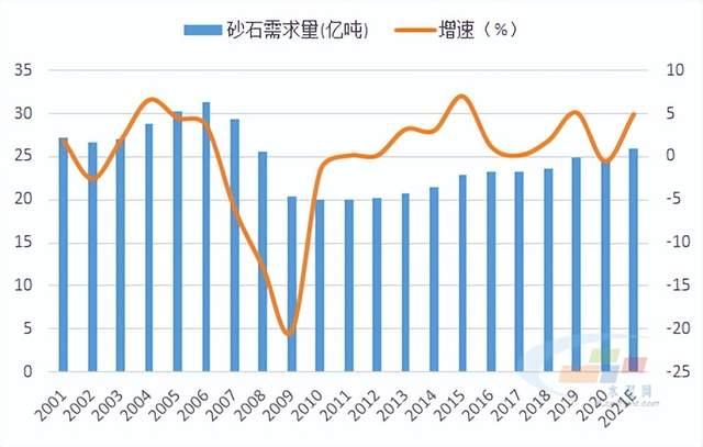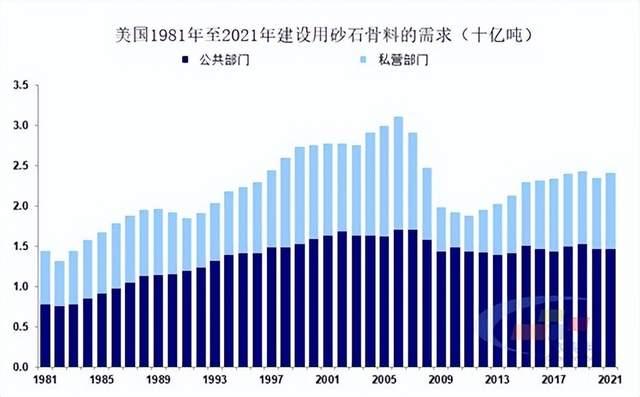 根據(jù)美國地質局數(shù)據(jù),2021年,美國砂石總需求達26億噸,同比增長4.97%,近年來砂石需求呈小幅上升趨勢。
