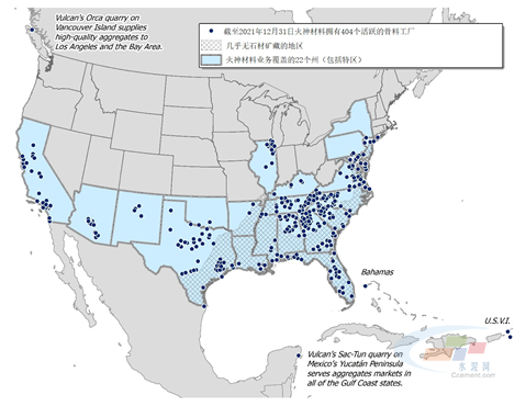 作為美國最大的骨料供應商,火神材料有其獨特的行業(yè)地位,據(jù)公司財報披露,2021年四季度,公司營收占美國前十大建筑材料生產(chǎn)商總和的28.66%,穩(wěn)坐第一(收購第六大US Concrete后進一步達到34.5%)。截至2021年12月31日,公司業(yè)務已覆蓋美國22個州,有404家骨料工廠,69家瀝青工廠,173家混凝土工廠以及1家鈣工廠,骨料總儲量高達156億噸。