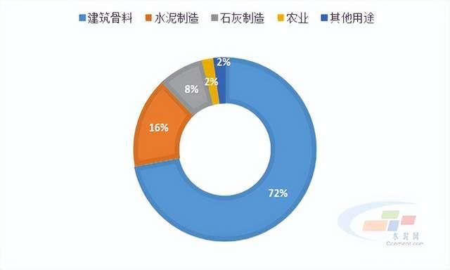 從用途來看,據(jù)美國地質局估計,約72%的碎石用作建筑骨料,主要用于道路建設和維護,約16%用于水泥制造業(yè),8%用于石灰制造,2%用于農(nóng)業(yè),其余2%用于化學等其他用途。