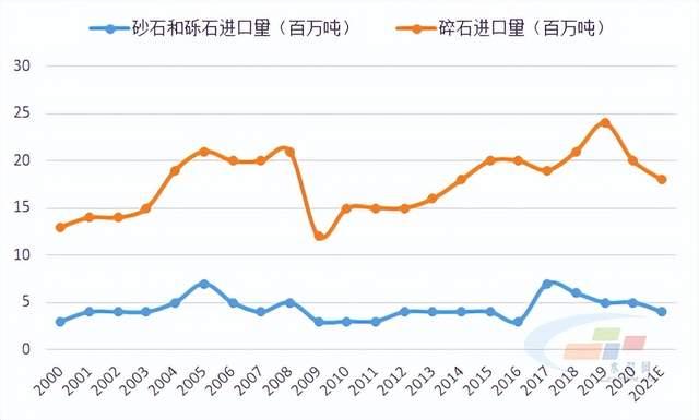 總的來說,美國的沙子和礫石、碎石是基本自給自足的,其進出口量較小。從出口來看,沙子和礫石、碎石的出口量常年在一百萬噸上下,波動較小。從進口來看,砂石進口量占比極小,砂石進口量占砂石表觀消費量的比例尚不足1%,2021年沙子和礫石、碎石進口分別減少20%和10%。