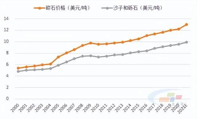 圖2-8:美國的砂石骨料價格總體呈現(xiàn)呈上升漲趨勢