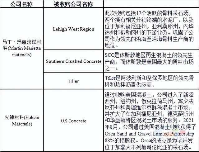 2021年,十大骨料生產(chǎn)商占美國骨料總產(chǎn)量的33%,如上所述,就頭部兩家企業(yè)來看,收購是企業(yè)發(fā)展戰(zhàn)略的重要環(huán)節(jié),美國砂石行業(yè)集中度將進一步得到提升。